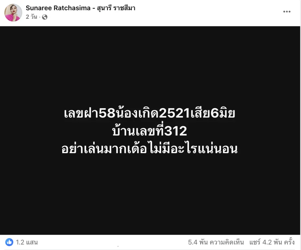 อย่างไรก็ตาม ท่ามกลางความโศกเศร้า “แม่สุนารี” ก็ไม่ลืมแฟนๆ สายเลขเด็ด โดยได้ทิ้งท้ายโพสต์อีกครั้ง พร้อมแคปชั่นว่า