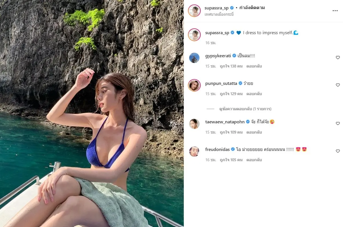 งานนี้ก็ทำเอาแฟนคลับและเพื่อน ๆ ในวงการบันเทิงถึงกับอดรนทนไม่ไหว ต้องขอเข้าไปคอมเมนต์แซวกันซะหน่อย เพราะนาน ๆ ทีจะได้เห็น เก้า สุภัสสรา จัดหนักจัดเต็มขนาดนี้