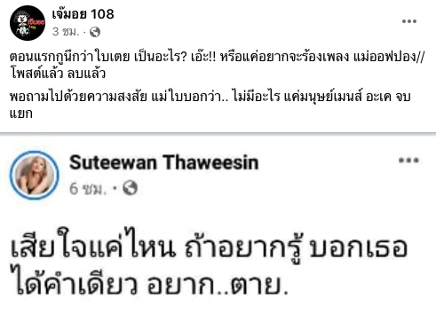 ล่าสุดไม่รู้ว่าเกิดอะไรเมือเธอออกมาโพสต์แคปชั่น เสียใจแค่ไหน ถ้าอยากรู้ บอกเธอได้คำเดียว อยาก…ตาย ทันทีที่โพสต์ไปก็ทำแฟนๆตกใจไม่น้อยว่าเกิดอะไรกับเธอ ก่อนโพสต์ดังกล่าวถูกลบออกไป ล่าสุดเพจดังอย่างเจ๊มอย108 ได้ออกมาคลายความสงสัยแล้วว่า ตอนแรกกูนึกว่าใบเตย เป็นอะไร? เอ๊ะ!! หรือแค่อยากจะร้องเพลง แม่ออฟปอง // โพสต์แล้ว ลบแล้ว พอถามไปด้วยความสงสัย แม่ใบบอกว่า.. ไม่มีอะไร แค่มนุษย์เมนส์ อะเค จบแยก ก็เอาเป็นว่าสบายใจได้แม่ไม่เป็นอะไร แค่อารมณ์สวิง