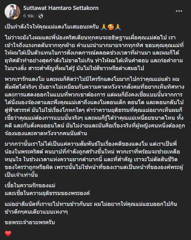 ‘มากกว่านั้นเราไม่ได้เป็นแค่ความสัมพันธ์ในเรื่องคดีของแตงโม แต่เราเป็นพี่น้องในพระคริสต์ คนบาปที่กำลังถูกสร้างขึ้นใหม่ พวกเราที่พร้อมจะช่วยเหลือ หนุนใจ ในช่วงเวลาแห่งความยากลำบากนี้ และที่สำคัญ เราจะไม่ตัดสินชีวิตของใครว่าถูกหรือผิด เพราะนั้นไม่ใช่หน้าที่ของเราแต่เป็นหน้าที่ขององค์พระผู้เป็นเจ้าเท่านั้น’
