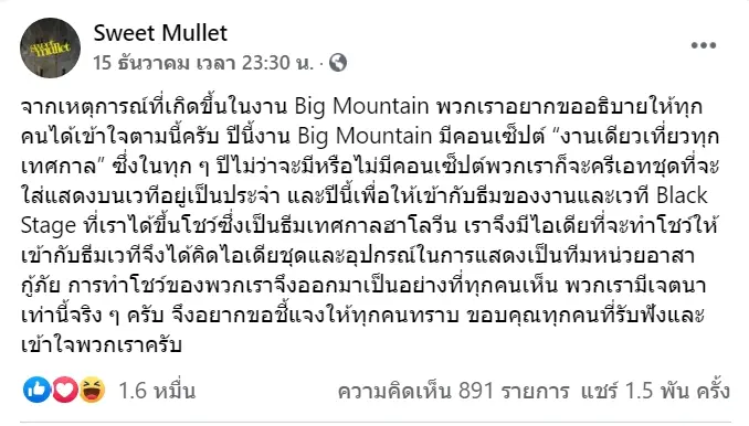 “จากเหตุการณ์ที่เกิดขึ้นในงาน Big Mountain พวกเราอยากขออธิบายให้ทุกคนได้เข้าใจตามนี้ครับ ปีนี้งาน Big Mountain มีคอนเซ็ปต์ “งานเดียวเที่ยวทุกเทศกาล” ซึ่งในทุก ๆ ปีไม่ว่าจะมีหรือไม่มีคอนเซ็ปต์พวกเราก็จะครีเอทชุดที่จะใส่แสดงบนเวทีอยู่เป็นประจำ และปีนี้เพื่อให้เข้ากับธีมของงานและเวที Black Stage ที่เราได้ขึ้นโชว์ซึ่งเป็นธีมเทศกาลฮาโลวีน เราจึงมีไอเดียที่จะทำโชว์ให้เข้ากับธีมเวทีจึงได้คิดไอเดียชุดและอุปกรณ์ในการแสดงเป็นทีมหน่วยอาสากู้ภัย การทำโชว์ของพวกเราจึงออกมาเป็นอย่างที่ทุกคนเห็น พวกเรามีเจตนาเท่านี้จริง ๆ ครับ จึงอยากขอชี้แจงให้ทุกคนทราบ ขอบคุณทุกคนที่รับฟังและเข้าใจพวกเราครับ”