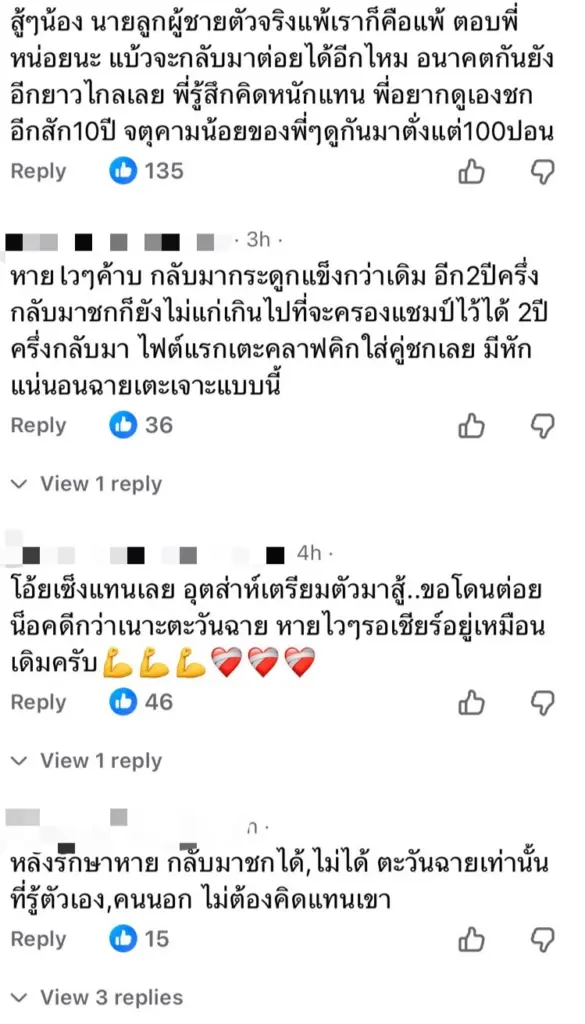 ขณะที่แฟนมวยจำนวนมากยังคงหลั่งไหลเข้ามาคอมเมนต์ให้กำลังใจ พร้อมส่งแรงเชียร์ให้ยอดมวยซ้ายดารากลับมาแข็งแกร่งกว่าเดิม โดยหลายเสียงย้ำตรงกันว่า ชัยชนะที่แท้จริง คือการกลับมาอย่างปลอดภัย