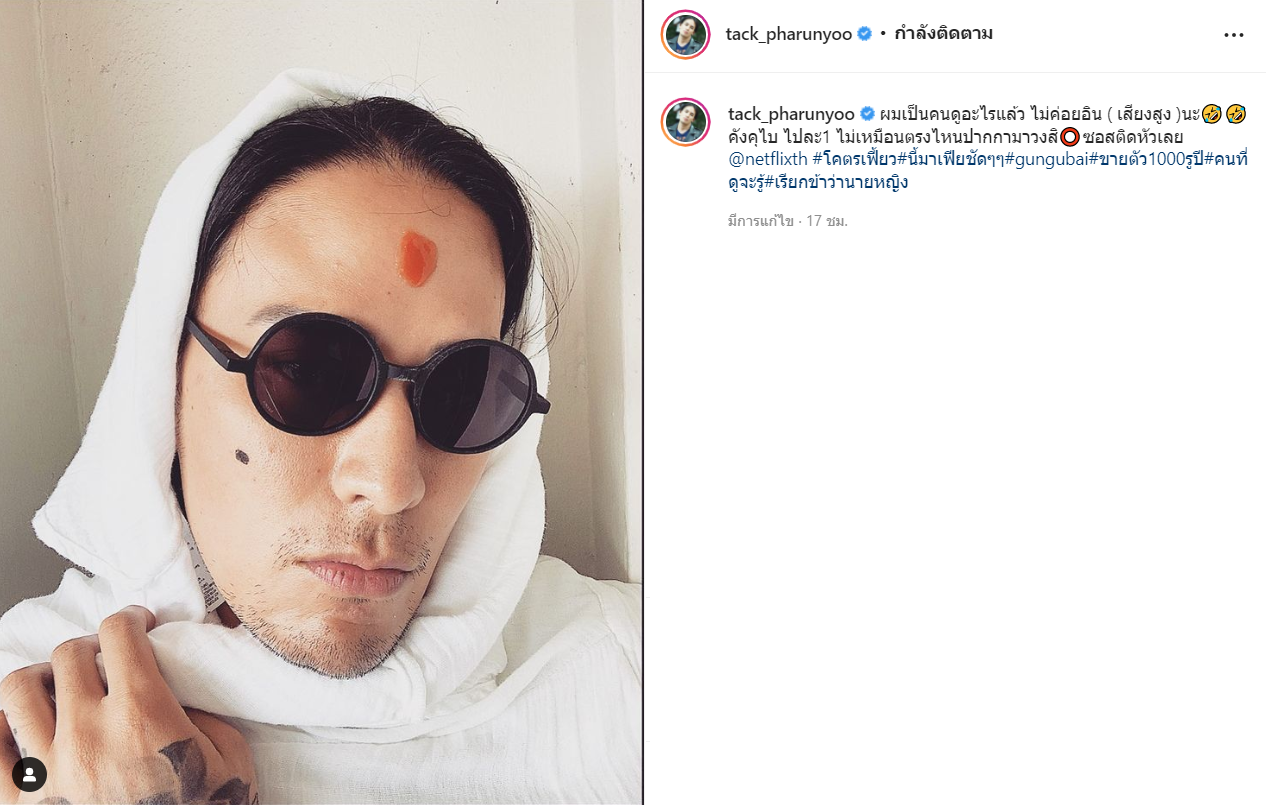 แทค ภรัณยู ร่วมอินด้วย! ลงทุนคัฟเวอร์เป็น คังคุไบ จากหนังอินเดีย Gangubai Kathiawadi ที่กำลังเป็นไวรัลในไทยขณะนี้ เจ้าตัวลั่น ไม่เหมือนตรงไหน เอาปากกมาวง