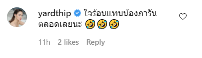 ซึ่งทางด้านหนุ่มแทค ภรัณยู เขาเองก็ยินดีให้กับการตั้งท้องของสาวหยาดเขาเช่นกัน โดยล่าสุด เจ้าตัวก็ได้มาขอจองตัวเบบี๋ในท้องให้กับลูกชายอย่าง น้องภารัน กันตั้งแต่ตอนนี้ แม้ว่าจะยังไม่รู้เพศก็ไม่ใช่ปัญหาใดๆ เพราะหนุ่มแทคเขาประกาศลั่นเลยว่า ถึงจะเป็นลูกชายก็จะจองให้มาเป็นคู่จิ้นกับน้องภารัน โดยเจ้าตัวได้ระบุว่า “ถ้าเธอ @yardthip ได้ลูกผู้หญิง?ฉันจะให้ ภารัน จีบลูกสาวเธอ ฉันจองละนะถ้าได้ผู้ชาย เดียวให้จิ้นกัน สาย Y”