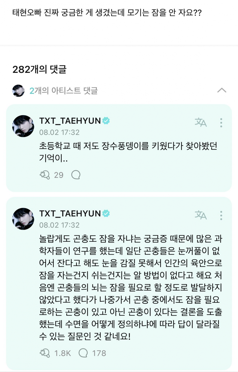 แทฮยอนเขียนตอบกลับไปว่า “ผมจำได้ว่าเคยอ่านเรื่องนี้ตอนที่ผมเลี้ยงด้วงตอนอยู่ชั้นประถม…” เขายังคงเขียนต่อไปว่า “น่าแปลกที่นักวิชาการจำนวนมากค้นคว้าเรื่องนี้เพราะอยากรู้ว่าแมลงนอนหลับไหม อย่างแรก แมลงไม่มีเปลือกตา ดังนั้น ถึงแม้ว่าพวกมันจะหลับอยู่ก็ไม่สามารถเห็นได้ว่าพวกมันกำลังหลับจริง ๆ หรือแค่พักสายตา มนุษย์ของเราก็มีพวกที่บอกว่าแมลงไม่มีสมองที่โตพอที่จะต้องนอน แต่ก็มาสรุปว่ายังมีแมลงที่จำเป็นต้องนอนด้วย อีกอย่าง ผมคิดว่าคำตอบของคำถามนี้จะเปลี่ยนไปตามคำจำกัดความของการนอน!”