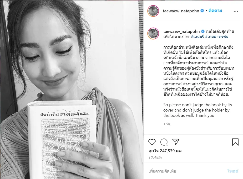 ดราม่าสนั่น! เกิดเป็นกระแสวิพากษ์วิจารณ์ในประเด็นการเมืองเข้าจนได้ สำหรับ แต้ว ณฐพร เตมีรักษ์ นางเอกสาวชื่อดัง หลังเจ้าตัวโพสต์ภาพถ่ายขณะถือหนังสือบันทึกของ ภรณ์ทิพย์ มั่นคง หรือ กอฟ อดีตผู้ต้องหาคดี มาตรา 112 ลงบนอินสตาแกรม @ taewaew_natapohn ซึ่งปรากฎให้เห็นข้อความบริเวณหน้าปกว่า “มันทำร้ายเราได้แค่นี้แหละ”