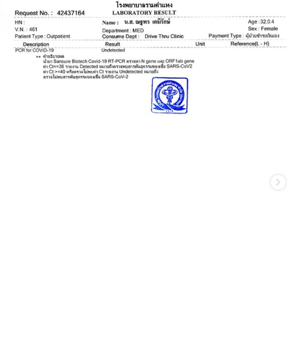 โดยสาวแต้วได้มาโพสต์อัพเดต พร้อมลงรูปผลตรวจลงในไอจีส่วนตัวของเธอ พร้อมกับเขียนแคปชั่นว่า “Day21 #แต้วว่าแต้วรอด” โดยงานนี้ก็มีเหล่าเพื่อนๆ ในวงการต่างก็มาแสดงความยินดีกับเธอ รวมไปถึงชาวเน็ต ซึ่งบางคนก็ได้ออกมาแซวสาวแต้วว่า สงสัยนี่จะเป็นอำนาจของเจ้าแม่นาคีที่ทำให้เธอไม่ติดเชื้อโควิดแม้ว่าจะผ่านการใกล้ชิดกับผู้ติดเชื้อมาแล้วหลายครั้ง