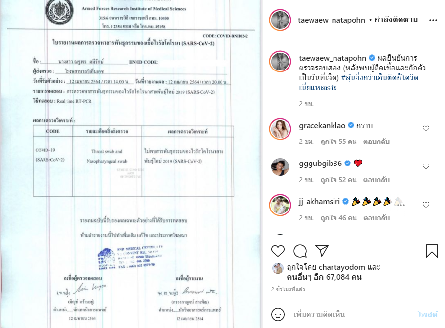 หลังจากที่นางเอกสาว แต้ว ณฐพร ทราบข่าวว่าตนเองมีโอกาสใกล้ชิดกับผู้ที่ติดเชื้อโควิด-19 และได้เดินทางไปตรวจเมื่อวันที่ 7 เมษายนที่ผ่านมาเป็นรอบแรก