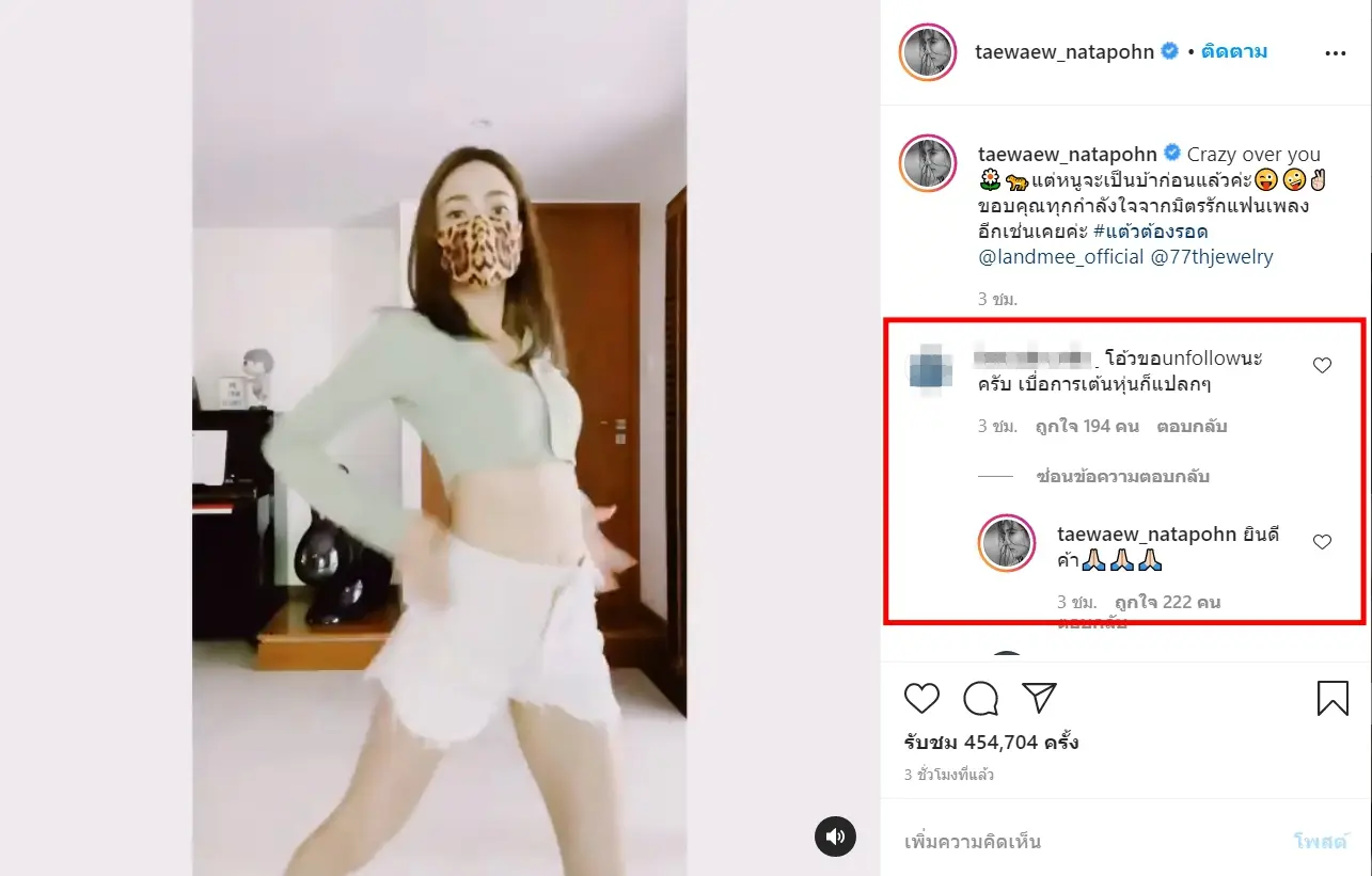 จากนั้นก็ได้มีชาวเน็ตรายหนึ่งเข้ามาคอมเมนต์ทำนองแซะสาวแต้วว่า “โอ้วขอunfollowนะครับ เบื่อการเต้นหุ่นก็แปลกๆ”