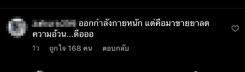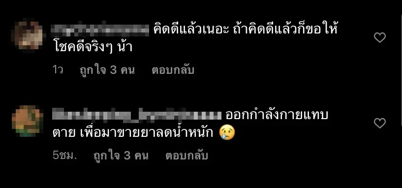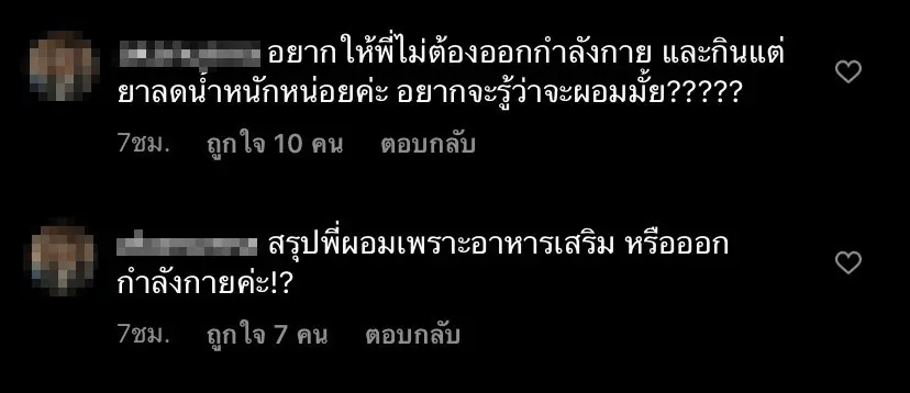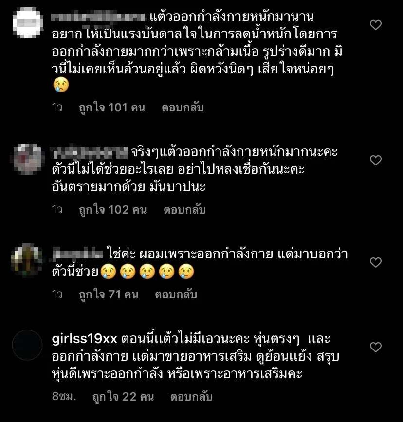 คิดดีแล้วเนอะ ถ้าคิดดีแล้วก็ขอให้โชคดีจริงๆน้า , ออกกำลังกายแทบตายเพื่อมาขายยาลดน้ำหนัก , อยากให้พี่ไม่ต้องออกกำลังกาย และกินแต่ยาลดน้ำหนักหน่อยค่ะ อยากจะรู้ว่าจะผอมมั้ย????? , สรุปพี่ผอมเพราะอาหารเสริม หรือออกกำลังกายคะ!?