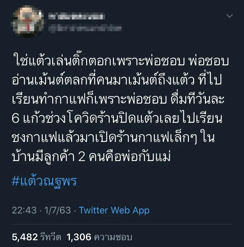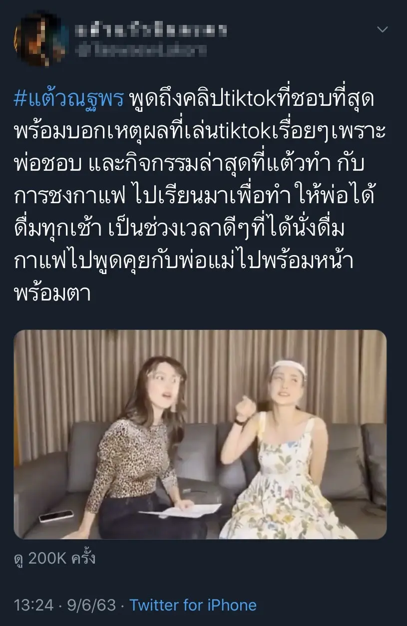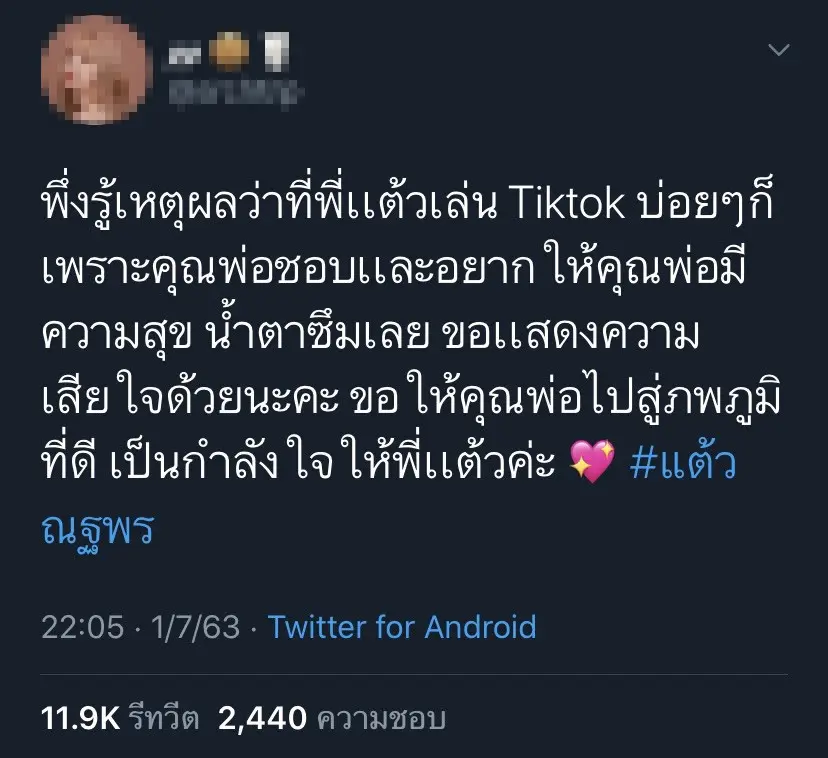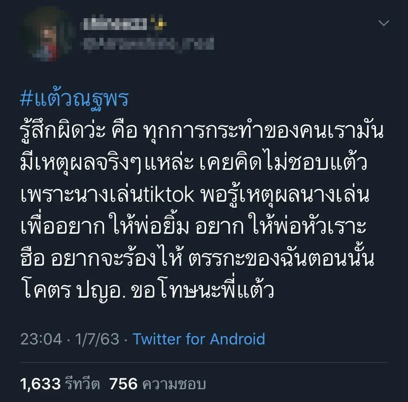 หลังจากทราบเรื่องราวการเสียชีวิตของ พลอากาศตรี ณรงค์ หรือ คุณพ่อของ แต้ว ณฐพร ชาวเน็ตก็พากันติดแฮชแท็ก แต้ว ณฐพร เพื่อพูดคุยเรื่องราวเกี่ยวกับประเด็นเรื่องแอพพลิเคชั่น TikTok ที่เจ้าตัวเล่นซึ่งหากย้อนกลับไปกระแสที่แต้วเล่น TikTok ก็มีทั้งดีและไม่ดี แต่สิ่งที่ทำให้ชาวเน็ตถึงกับลึกซึ้งในสิ่งที่แต้วเคยพูดก่อนที่คุณพ่อจะเสียชีวิตว่า “สาเหตุที่เล่นเพราะคุณพ่อชอบดู ชอบอ่านคอมเมนต์ตลกๆ” ดังนั้น จึงมีเหล่าบรรดาแฟนคลับมามากที่ออกมาถูกถึงประเด็นนี้ บางคอมเมนต์ถึงกับบอกว่า ” รู้สึกผิดว่ะ คือ ทุกการกระทำของเรามันมีเหตุผลจริงๆแหละ เคยคิดไม่ชอบแต้วเพราะนางเล่น TikTok พอรู้เหตุผลนางเล่นเพื่ออยากให้พ่อยิ้ม อยากให้พ่อหัวเราะ ฮือ อยากจะร้องไห้ ตรรกของฉันตอนนั้นโคตร ปญอ. ขอโทษนะเเต้ว”