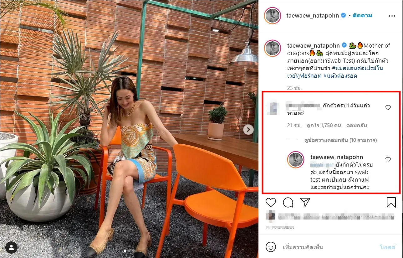 โดยโพสต์ดังกล่าวได้ระบุแคปชั่นว่า “Mother of dragons @polliploy ชุดพบปะผู้คนและโลกภายนอก (ออกมา Swab Test) แค่แวะซื้อกาแฟ 5 นาที ก่อนตรงกลับไปกักตัวเหงาๆ ต่อที่บ้านจ้า #แมสแอนด์สเปรย์โนเวย์ทูฟอร์กอท #แต้วต้องรอด”