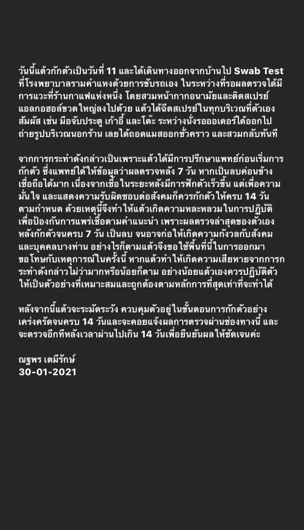 จากการกระทำดังกล่าวเป็นเพราะแต้วได้มีการปรึกษาแพทย์ก่อนเริ่มการกักตัว ซึ่งแพทย์ได้ให้ข้อมูลว่าผลตรวจหลัง 7 วัน หากเป็นลบค่อนข้างเชื่อถือได้มาก เนื่องจากเชื้อในระยะหลังมีการฟักตัวเร็วขึ้น แต่เพื่อความมั่นใจ และแสดงความรับผิดชอบต่อสังคมก็ควรกักตัวให้ครบ 14 วันตามกำหนด ด้วยเหตุนี้จึงทำให้แต้วเกิดความหละหลวมในการปฏิบัติ เพื่อป้องกันการแพร่เชื้อตามคำแนะนำ เพราะผลตรวจล่าสุดของตัวเอง หลังกักตัวครบ 7 วันเป็นลบ จนอาจก่อให้เกิดความกังวลกับสังคมและบุคคลบางท่าน อย่างไรก็ตามแต้วขอใช้พื้นที่นี้ในการออกมาขอโทษกับเหตุการณ์ในครั้งนี้ หากแต้วทำให้เกิดการเสียหายจากการกระทำดังกล่าวไม่ว่ามากหรือน้อยก็ตาม อย่างน้อยแต้วเองควรปฏิบัติตัวให้เป็นตัวอย่างที่เหมาะสมและถูกต้องตามหลักการที่สุดเท่าที่จะทำได้