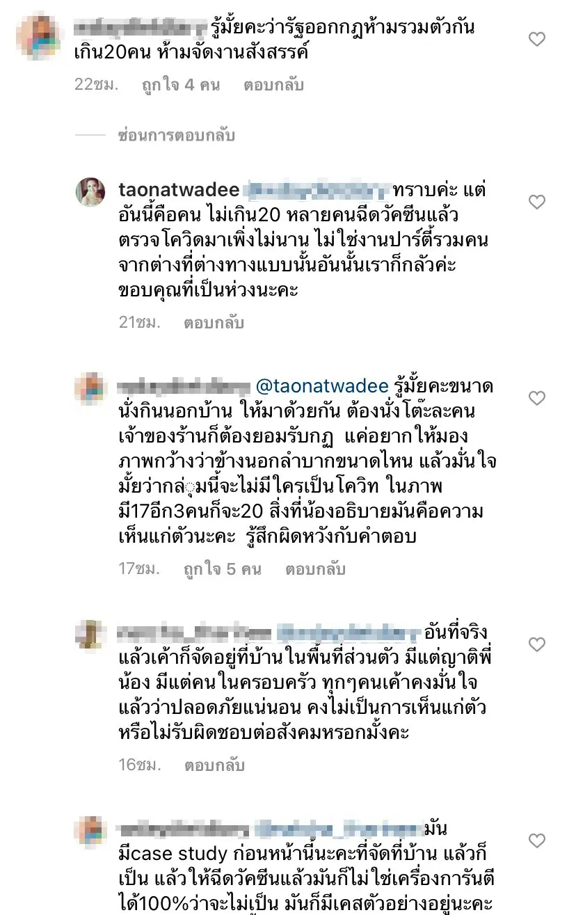 ซึ่งพี่สาวแต้ว ได้ตอบกลับไปว่า “ทราบค่ะ แต่อันนี้คือคน ไม่เกิน 20 หลายคนฉีดวัคซีนแล้ว ตรวจโควิดมาเพิ่งไม่นาน ไม่ใช่งานปาร์ตี้รวมคนจากต่างที่ต่างทางแบบนั้นอันนั้นเราก็กลัวค่ะ ขอบคุณที่เป็นห่วงนะ“