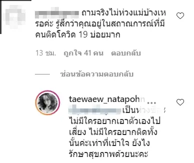 ซึ่งก็ได้มีชาวเน็ตรายหนึ่งเข้ามาคอมเมนต์ว่า “ถามจริงไม่ห่วงแม่บ้างเหรอคะ รู้สึกว่าคุณอยู่ในสถานการณ์ที่มีคนติดโควิด 19 บ่อยมาก” เจ้าตัวจึงเข้ามาตอบกลับทันทีว่า “เป็นห่วงซิคะ ไม่มีใครอยากเอาตัวเองไปเสี่ยง ไม่มีใครอยากติดทั้งนั้นค่ะเท่าที่เข้าใจ ยังไงรักษาสุขภาพด้วยนะคะ”