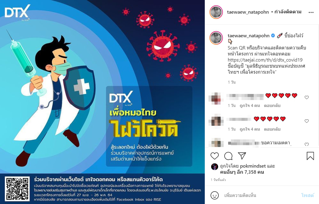 ล่าสุด ในคอมเมนท์อินสตาแกรมของ แต้ว ณฐพร ดาราสาวชื่อดัง ก็มีความเห็นถึงเรื่องการเมืองดังกล่าว หลังจากที่สาวแต้วได้โพสต์ภาพให้ร่วมบริจาคเงินสู้โควิด-19 ก็ได้มีผู้ใช้อินสตาแกรมรายหนึ่ง ได้แสดงความเห็นใต้รูปภาพ ว่า