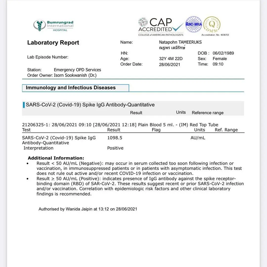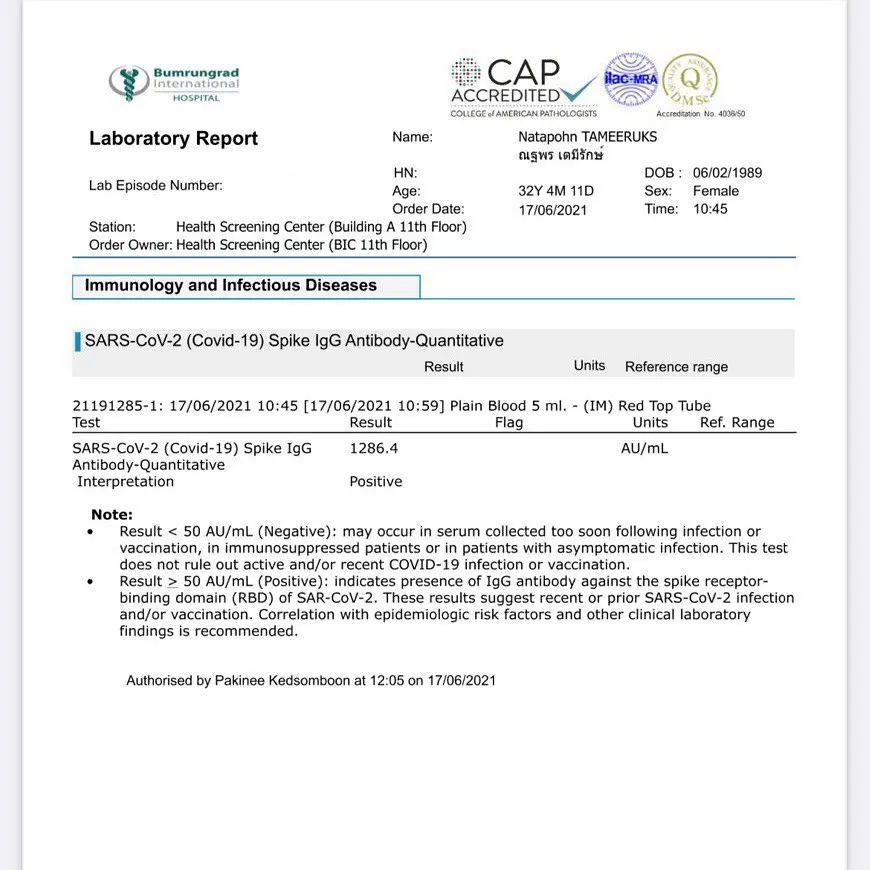 วันนี้แต้วได้ตรวจภูมิคุ้มกันไปด้วย ซึ่งเป็นผลหลังจากฉีดวัคซีน Sinovac ครบ 2 เข็มเป็นเวลา 28 วันได้ผล 1098.5 AU/mL ก่อนหน้านี้แต้วได้ตรวจภูมิคุ้มกันหลังจากฉีดวัคซีนครบ 2 เข็มเป็นเวลา 14 วัน ได้ผล 1286.4 AU/mL ค่ะ