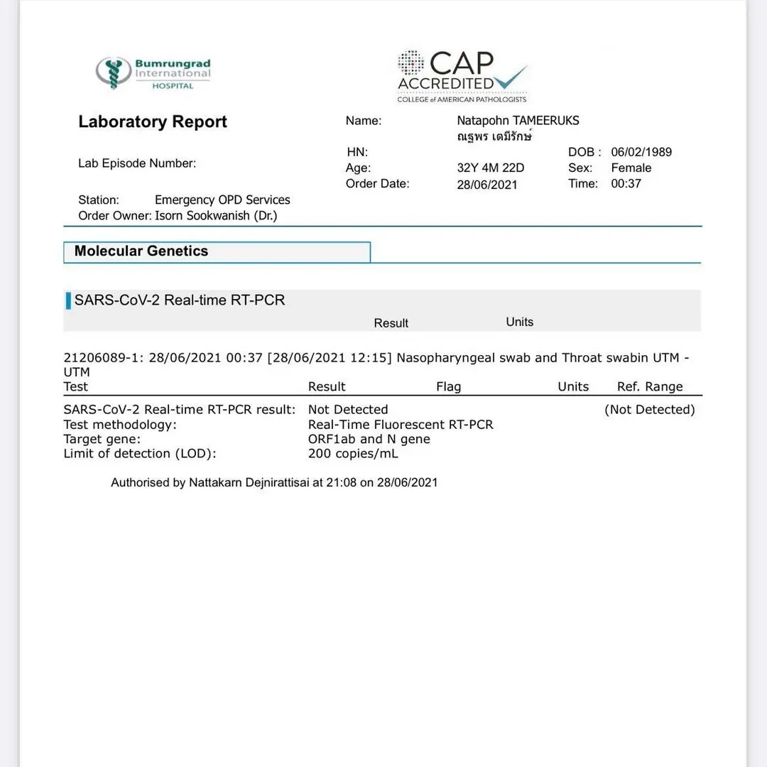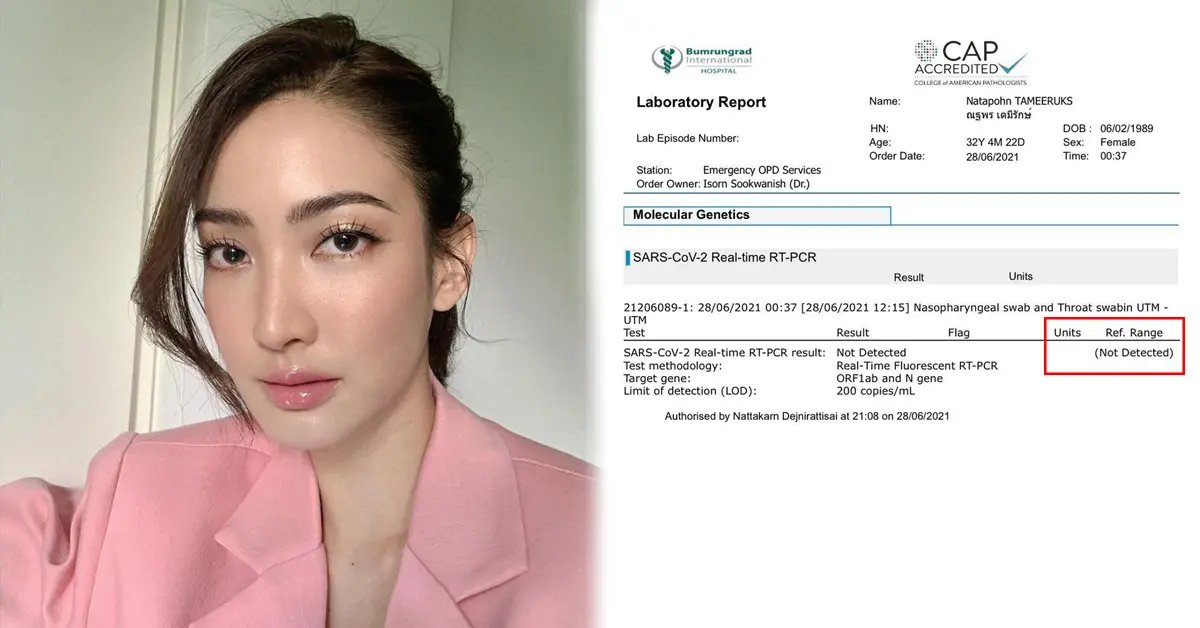 ล่าสุดสาว แต้ว ณฐพร ก็ได้แจ้งผลการตรวจหาเชื้อโควิดผ่านทางอินสตาแกรมของตัวเองกลางดึกของวันที่ 28 มิถุนายน ว่า “ไม่พบเชื้อโควิด19” พร้อมทั้งเผยผลตรวจภูมิคุ้มกันหลังฉีดวัคซีน Sinovac ครบ 2 เข็มด้วย โดยเธอได้โพสต์ว่า