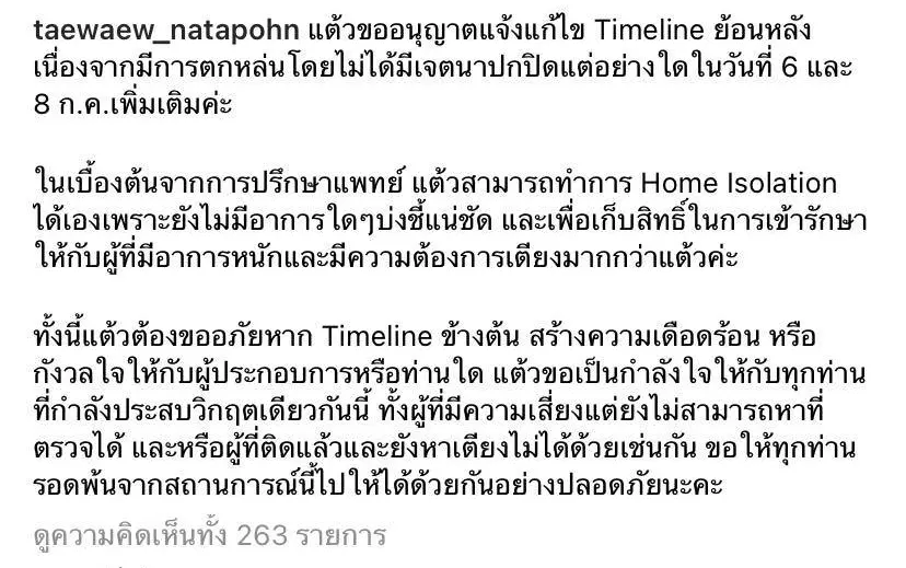 แต้ว ณฐพร แจ้งขอแก้ไทม์ไลน์ย้อนหลัง 14 วันหลังติดเชื้อ ไม่ได้มีเจตนาปกปิด ส่วนเรื่องอาการยังไม่มีอะไรหนัก หมอแนะนำให้กักตัวอยู่ที่บ้านก่อน พร้อมขอโทษที่ไทม์ไลน์ของตนเองไปสร้างความเดือดร้อนให้คนอื่น