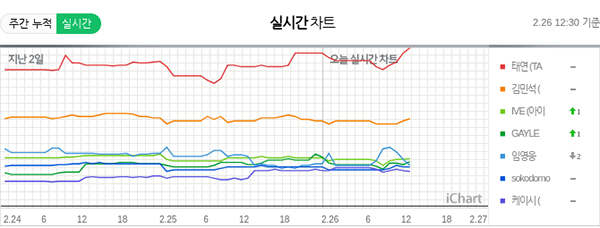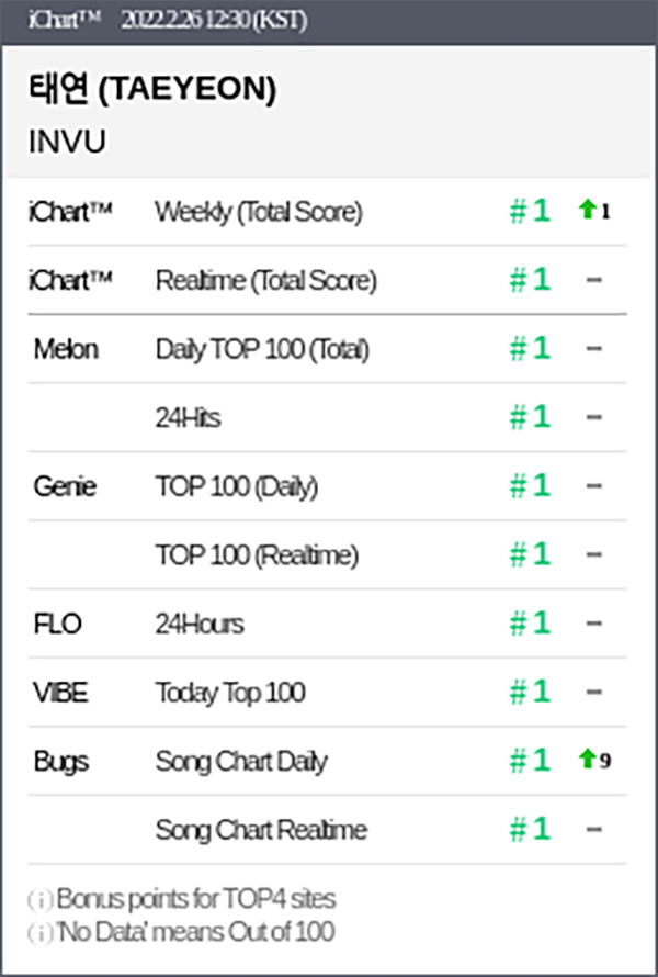 จากการอัพเดท iChart ครั้งล่าสุดเมื่อวันที่ 26 กุมภาพันธ์ เวลา 12:30 น. ตามเวลาเกาหลี เพลงไตเติ้ลอัลบั้มที่ 3 ของแทยอน “INVU” ได้ทำคะแนน Perfect all-kill (PAK) อย่างเป็นทางการแล้ว