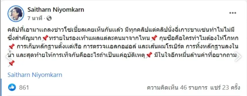 โดยเจ้าตัวได้มีการออกมาโพสต์เฟซบุ๊กส่วนตัวถึงประเด็นของหลักฐานที่เป็นคลิป ที่ได้มาจากโซเชียลมากมาย แต่มีอยู่หนึ่งคลิป ที่ไม่ได้มาอยู่ในการสรุปสำนวนในครั้งนี้ด้วย นั้นก็คือคลิปที่ขณะแตงโมได้ไปนั่งปัสสาวะบริเวญท้ายเรือ ซึ่งเจ้าตัวมองว่าสำคัญมาก รวมถึงข้อสงสัยอีกมากมายทั้งเรื่องของ ทรายในร้องเท้า กุนซือที่ให้คนบนเรือโกหกมีเหตุผลอะไร การให้การเท็จของผู้ต้องหา และอีกมากมายที่เจ้าตัวอยากจะถาม