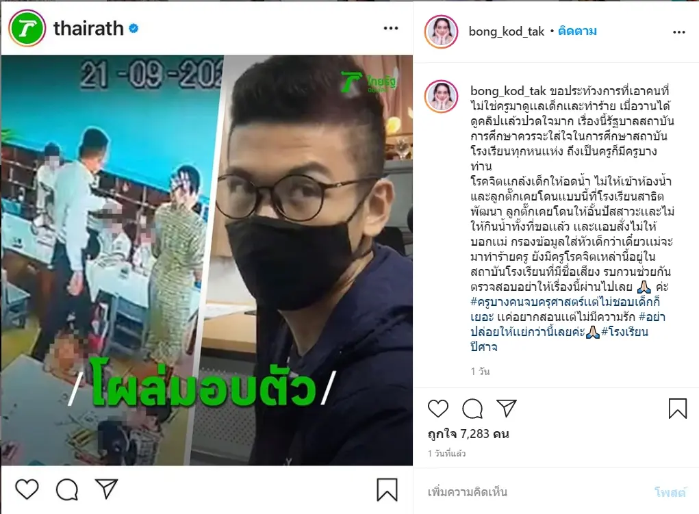 โดยล่าสุดตั๊ก ไดโพสต์ข้อความลงบนอินสตแกรมส่วนตัว พร้อมทั้งระบุว่า “ขอประท้วงการที่เอาคนที่ไม่ใช่ครูมาดูเเลเด็กเเละทำร้าย เมื่อวานได้ดูคลิปเเล้วปวดใจมาก เรื่องนี้รัฐบาลสถาบันการศึกษาควรจะใส่ใจในการศึกษาสถาบันโรงเรียนทุกหนเเห่ง ถึงเป็นครูก็มีครูบางท่าน