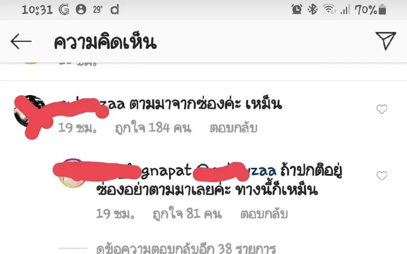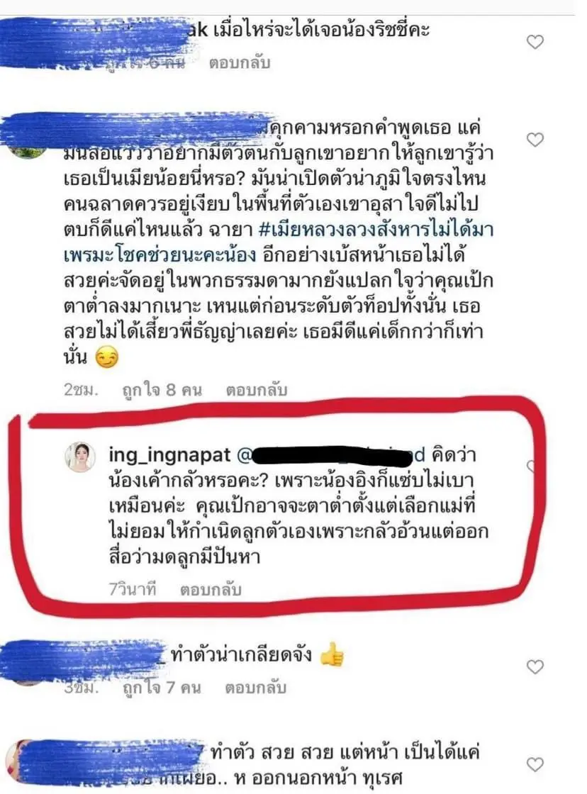 โดย อิงอิง ได้เข้าไปคอมเมนต์โต้ตอบด้วยถ้อยคำรุนเเรงถึง ธัญญ่า ว่า “คิดว่าน้องเค้ากลัวหรอคะ เพราะน้อง…ก็แซ่บไม่เบาเหมือนกัน คุณเป๊กอาจจะตกต่ำตั้งเเต่เลือกเเม่ที่ไม่ยอมให้กำเนิดลูกตัวเองเพราะกลัวอ้วน เเต่ออกสื่อว่ามดลูกมีปัญหา”