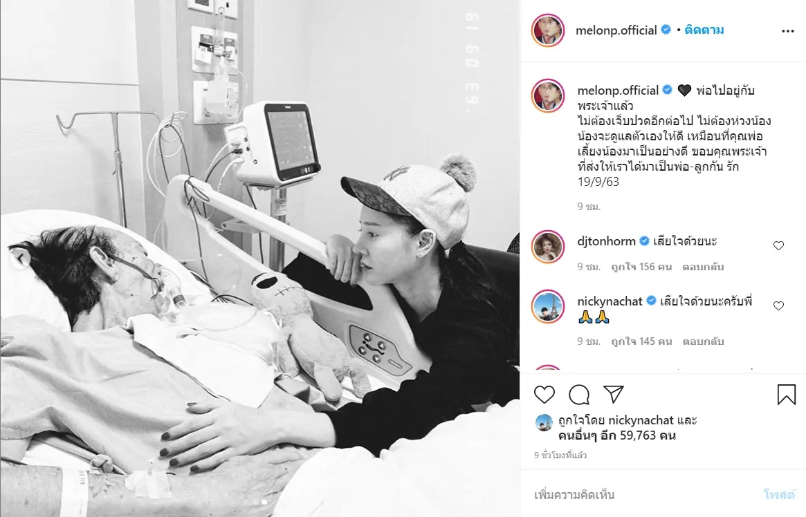 แต่ล่าสุด แตงโม นิดา ก็ได้โพสต์รูปและข้อความผ่านอินสตาแกรมของตัวเองว่า “พ่อไปอยู่กับพระเจ้าแล้ว ไม่ต้องเจ็บปวดอีกต่อไป ไม่ต้องห่วงน้อง น้องจะดูแลตัวเองให้ดี เหมือนที่คุณพ่อ เลี้ยงน้องมาเป็นอย่างดี ขอบคุณพระเจ้า ที่ส่งให้เราได้มาเป็นพ่อ-ลูกกัน รัก 19/9/63”