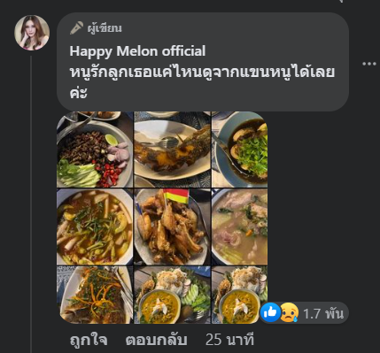 จากนั้น มือปริศนา ก็ได้โพสต์ภาพและข้อความเพิ่มเติมใต้โพสต์เดียวกัน ซึ่งเป็นรูปรวมอาหารหลาย ๆ จาน พร้อมคำบรรยาย “หนูรักลูกเธอแค่ไหน ดูจากแขนหนูได้เลยค่ะ”