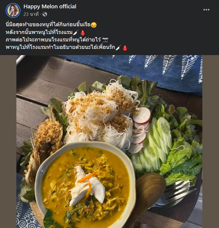 แตงโม ล่าสุด เพจ Happy Melon official เคลื่อนไหวอีกครั้ง! หลังโพสต์อาหารที่อ้างว่า “เป็นมื้อสุดท้าย” ก่อนขึ้นเรือ พร้อมแคปชันปริศนาโยงสู่เหตุการณ์ถัดไป