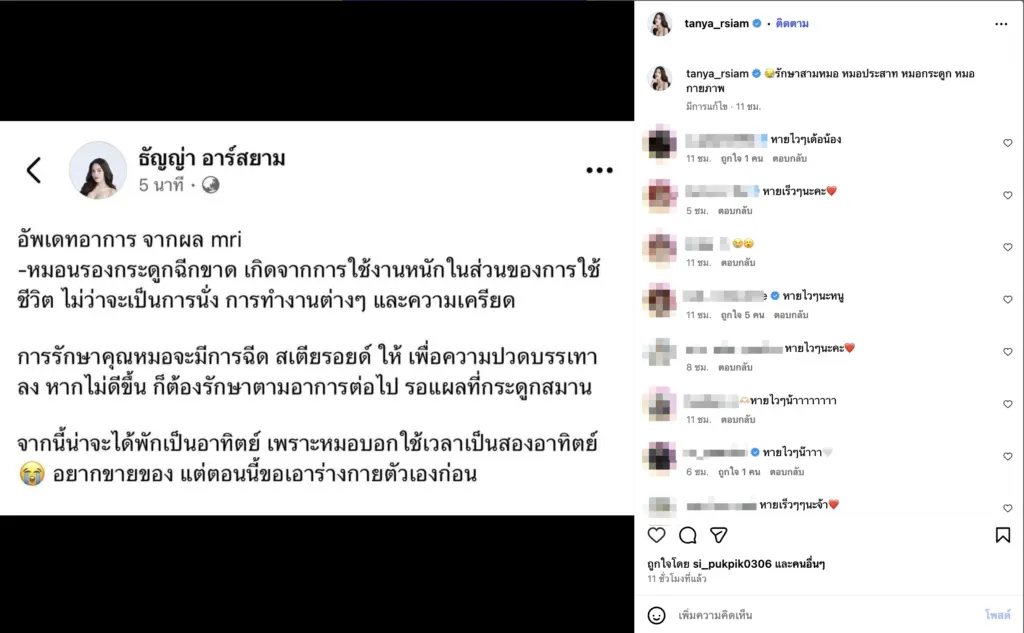 ธัญญ่าระบุว่า ตอนนี้แพทย์ได้วางแผนรักษาด้วยการ ฉีดสเตียรอยด์ เพื่อลดอาการปวด และต้องให้ร่างกายได้พักอย่างเต็มที่ โดยคุณหมอสั่งชัดเจนว่าต้องพักอย่างน้อย 2 สัปดาห์ เพื่อให้แผลบริเวณกระดูกสมานตัว พร้อมบอกตรง ๆ ว่า แม้อยากกลับไปทำงานและขายของ แต่ตอนนี้ต้องให้ความสำคัญกับสุขภาพก่อน