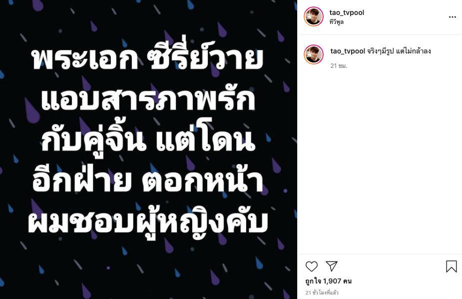 มีเป็นเด็นให้ได้ทำการบ้านกันอีกแล้ว หลัง เต๋า ทีวีพูลเปิดประเด็นร้อนวงการ โดยเจ้าตัวโพสต์ข้อความ พระเอกซีรีส์วาย สารภาพรักกับคู่จิ้น แต่โดนอีกฝ่ายตอกหน้า ผมชอบผู้หญิงคับ พร้อมทั้งบอกว่า จริงๆมีรูป แต่ไม่กล้าลง