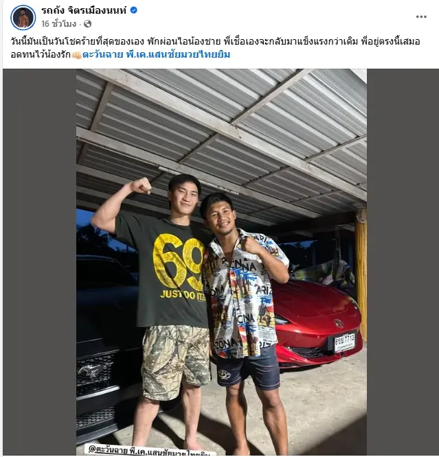 ล่าสุด รถถัง จิตรเมืองนนท์ ยอดนักมวยไทยขวัญใจแฟนๆ ก็ออกมาเคลื่อนไหวผ่านโซเชียลมีเดีย ส่งข้อความให้กำลังใจตะวันฉายอย่างอบอุ่น ระบุว่า