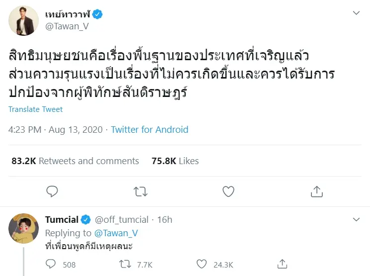 เป็นอีกคนบันเทิงที่ออกมาเเสดงจุดยืนสำหรับ เต ตะวัน วิหครัตน์ นักแสดงชื่อดังที่ออกมาโพสต์ข้อความผ่านทวิตเตอร์ว่า “สิทธิมนุษยชนคือเรื่องพื้นฐานของประเทศที่เจริญแล้ว