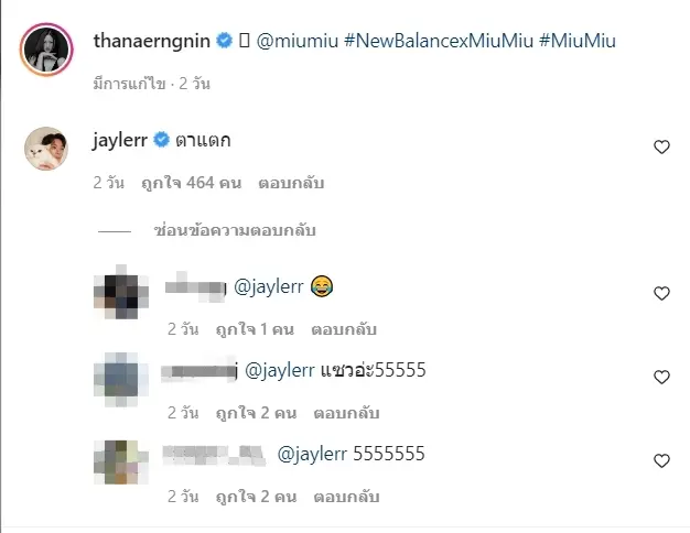 แต่ถึงจะชื่อของทั้งคู่จะถูกพูดถึงให้ประเด็นข่าวนี้ ก็ได้ส่งผลกระทบอะไรถึงทั้งคู่แม้แต่น้อย ยังมีการลงรูปคู่กับกันตามปกติ และในภาพที่สาวต้าเหนิงได้มีการไปร่วมถ่ายแฟชั่นให้กับแบรนด์ miu miu ที่มีการโชว์สัดส่วนช่วงหน้าท้องแบบต๊าช! ก็มีทางด้านของ เจเจ เข้าไปคอมเมนต์แซวแฟนสาวอย่างออกรสชาติว่า “ตาแตก” จนมีคนเข้าไปคอมเมนต์ต่อท้ายเจ้าตัวเป็นจำนวนมาก