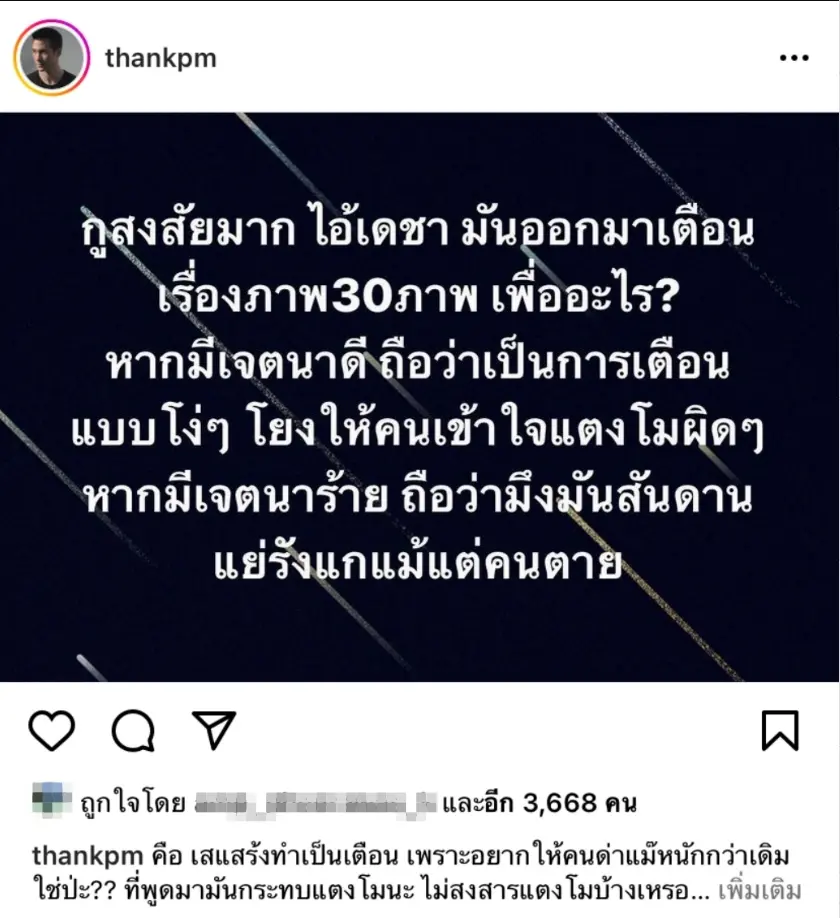 ก่อนที่จะมีคนเข้ามาคอมเมนต์เตือนการใช้คำพูดของ แต๊ง ว่าระวังอาจจะโดนทางด้านทนายเดชาฟ้องเหมือนครั้งที่แล้วก็ได้ ทำให้ในตอนนี้เจ้าตัวได้ลบโพสต์ดังกล่าวออกจากไอจีไปแล้ว