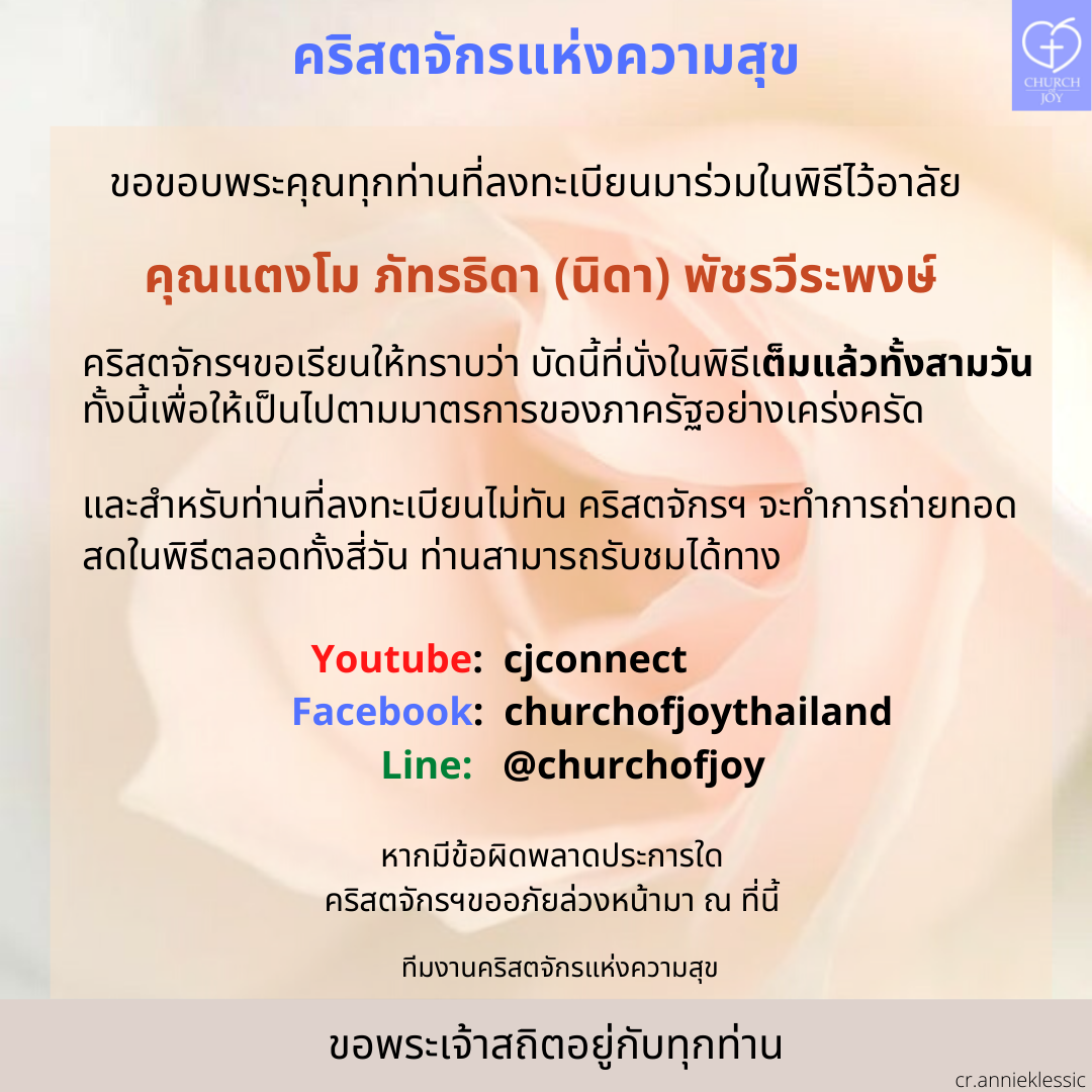 คนบันเทิงเตรียมเข้าร่วม พิธีไว้อาลัย นักแสดงชื่อดัง แตงโม นิดา อย่างสมเกียรติ โดยล่าสุดทางเพจ คริสตจักรแห่งความสุข ก็ได้โพสต์แจ้งว่าที่นั่งใน พิธีไว้อาลัย แตงโม นิดา เต็มแล้วทั้งสามวัน ตั้งแต่ 11-13 มี.ค. 65 แต่สำหรับคนที่ลงทะเบียนไม่ทันสามารถรับชมการถ่ายทอดสด พิธีไว้อาลัย แตงโม นิดา ได้ทางแพลตฟอร์มต่าง ๆ ตามประกาศของทางคริสตจักรก่อนหน้านี้