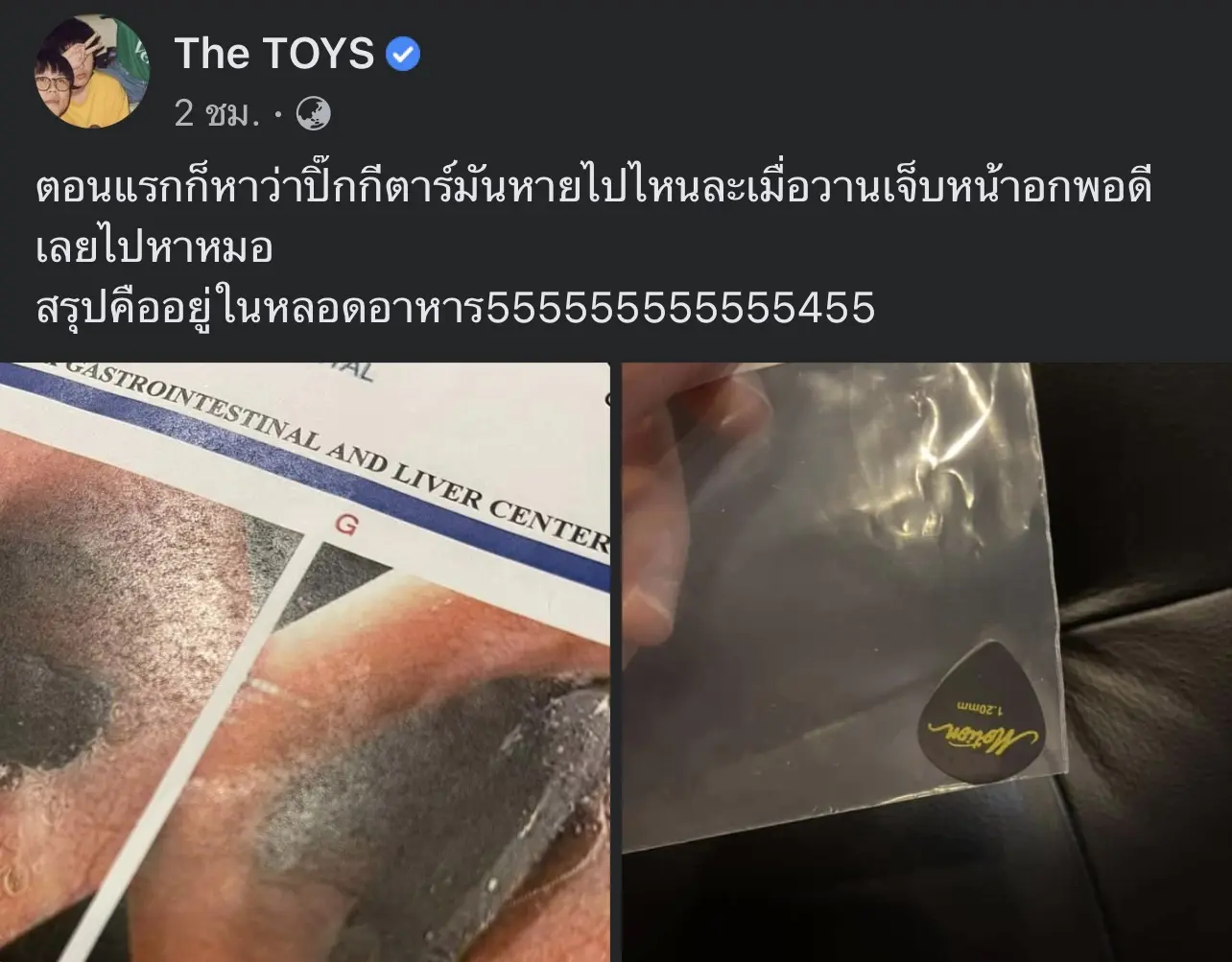 แฟนคลับยังกลั้นขำไม่ไหวเมื่อ “เดอะทอยส์” โพสต์เรื่องเหลือเชื่อ โดยบอกว่า “ตอนแรกก็หาว่าปิ๊กกีต้าร์มันหายไปไหนละเมื่อวานเจ็บหน้าอกพอดีเลยไปหาหมอ สรุปคืออยู่ในหลอดอาหาร 555555555555”