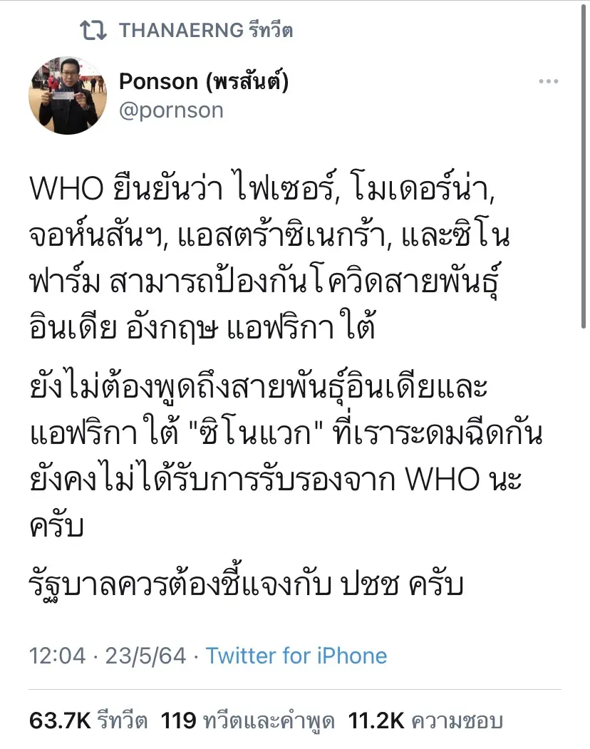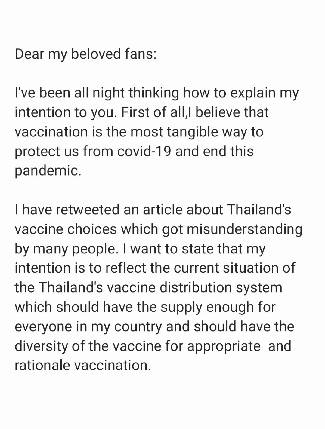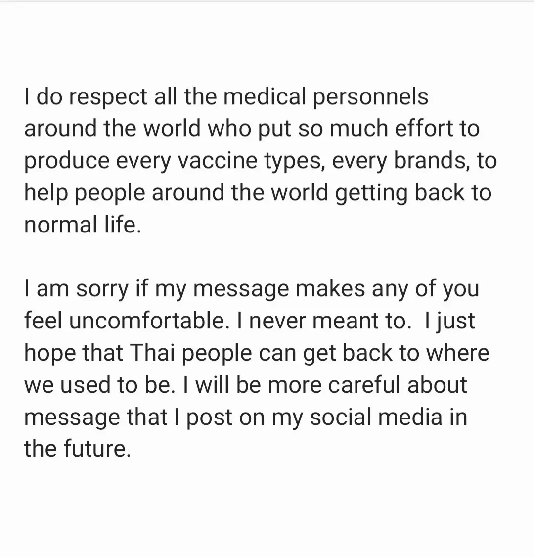 “และขอบอกว่าเคารพบุคลากรแพทย์ทั่วโลก ที่ใช้ความพยายามอย่างมากในการผลิตวัคซีนทุกชนิด เพื่อช่วยผู้คนทั่วโลกให้กลับไปใช้ชีวิตที่เป็นปกติ ขอโทษที่ทำให้ไม่สบายใจ และต่อไปจะระวังมากขึ้นเกี่ยวกับการโพสต์โซเชียลในอนาคต”