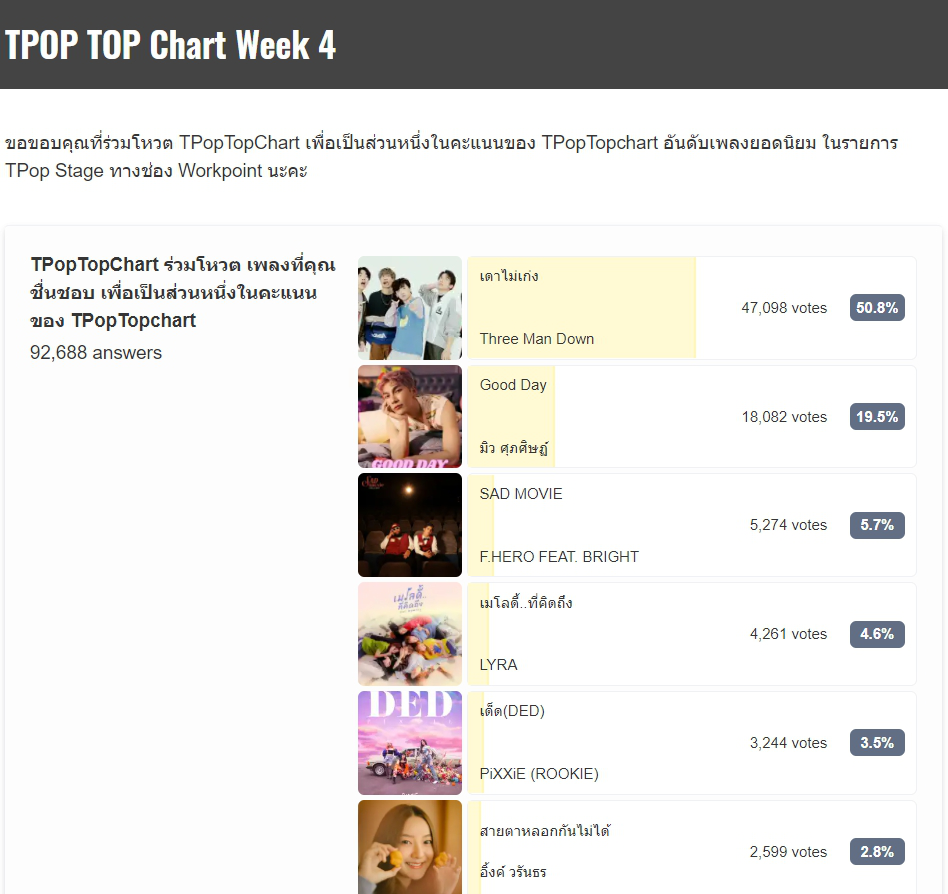 Three Man Down เรียกว่ายังอยู่ในช่วงการโหวต กับ T-POP STAGE ที่ได้จัดการโหวต TPopTopChart ซึ่งเป็นเพลงจากศิลปินไทยให้เหล่าแฟนคลับแฟนเพลงได้เข้ามาโหวตกัน