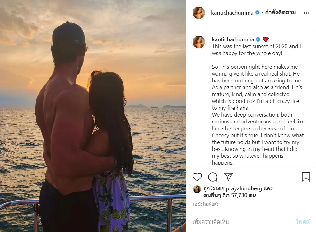 ซึ่งล่าสุด สาวติช่า ก็ได้ลงไอจีเป็นรูปแผ่นหลังของเจ้าตัว โอบกับหนุ่มฝรั่งหุ่นล่ำบึ้กมองพระอาทิตย์ตกดินอยู่บนเรือ พร้อมแคปชั่นความรักที่ยาวประหนึ่งเรียงความ ว่า