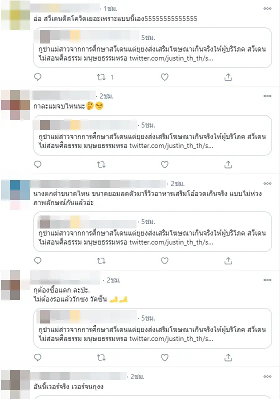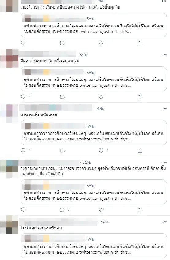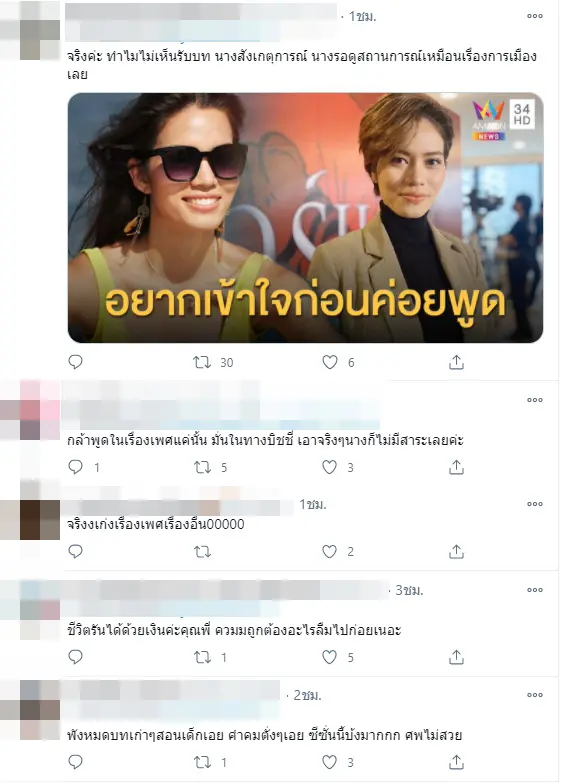 ทั้งนี้ ความเห็นมีทั้ง ‘กูขำแม่สาวจากการศึกษาสวีเดนแต่ยุยงส่งเสริมโฆษณาเกินจริงให้ผู้บริโภค สวีเดนไม่สอนศีลธรรม มนุษยธรรมหรอ’, ‘จริงค่ะ ทำไมไม่เห็นรับบท นางสังเกตุการณ์ นางรอดูสถานการณ์เหมือนเรื่องการเมืองเลย’, ‘กล้าพูดในเรื่องเพศแค่นั้น มั่นในทางบิชชี่ เอาจริงๆนางก็ไม่มีสาระเลยค่ะ’, ‘ชีวิตรันได้ด้วยเงินค่ะคุณพี่ ควมมถูกต้องอะไรลืมไปก่อนเนอะ’, ‘รับบทนางฉอด นางสอนเก่งแต่บ้ง’, ‘เลิกตามนางแล้วเพราะปลอมมาก ทุกอย่างคือเพื่อเงิน’, ‘รีวิวนี้ต้องไปศึกษาหาข้อมูลมาก่อนไหมหนอออติช่าา5555555’, ‘นางตกต่ำขนาดไหน ขนาดยอมลดตัวมารีวิวอาหารเสริมโอ้อวดเกินจริง แบบไม่ห่วงภาพลักษณ์กันแล้วอ่ะ’, ‘เอาอะไรกับนาง มันหมดซีนของนางไปนานแล้ว บ้งขึ้นทุกวัน’, ‘วงการมายาไทยอะนะ ไม่ว่าจะจบจากไหนมา สุดท้ายก็มาจบที่เดียวกันตรงนี้ คือจบสิ้นแล้วกับการมีสามัญสำนึก’