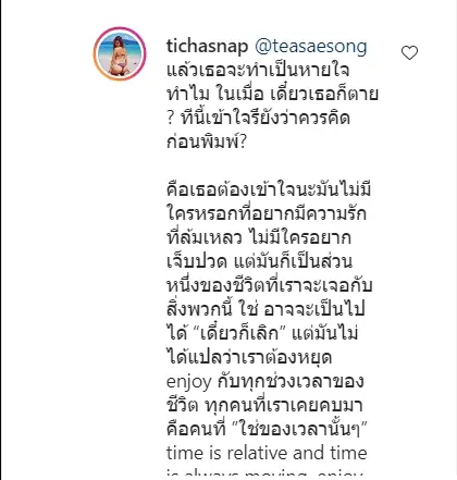 คือเธอต้องเข้าใจนะมันไม่มีใครหรอกที่อยากมีความรักที่ล้มเหลว ไม่มีใครอยากเจ็บปวด แต่มันก็เป็นส่วนหนึ่งของชีวิตที่เราจะเจอกับสิ่งพวกนี้ ใช่ อาจจะเป็นไปได้ “เดี๋ยวก็เลิก” แต่มันไม่ได้แปลว่าเราต้องหยุด enjoy กับทุกช่วงเวลาของชีวิต ทุกคนที่เราเคยคบมาคือคนที่ ”ใช่ของเวลานั้นๆ” time is relative and time is always moving, enjoy the journey.”