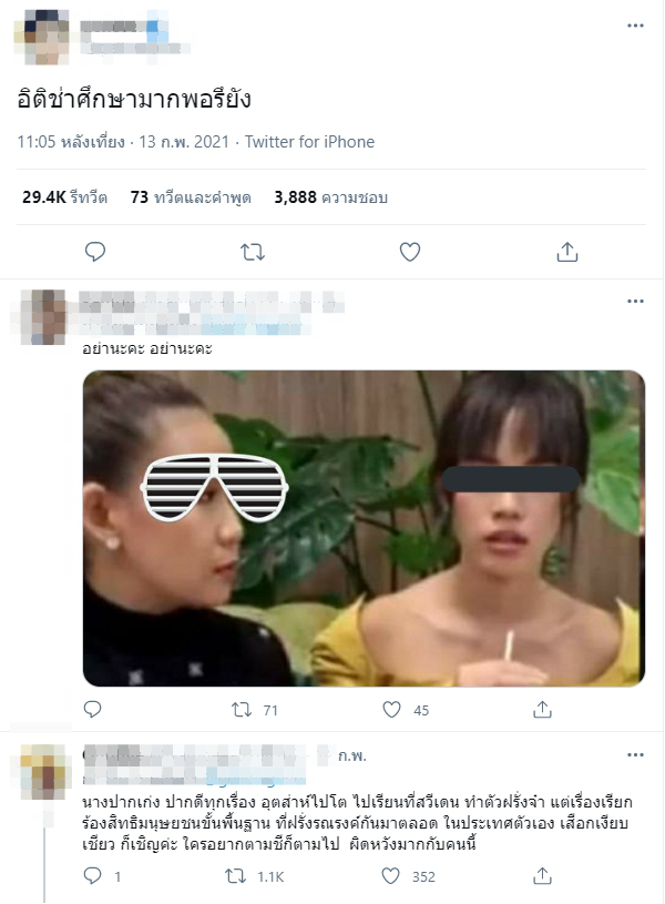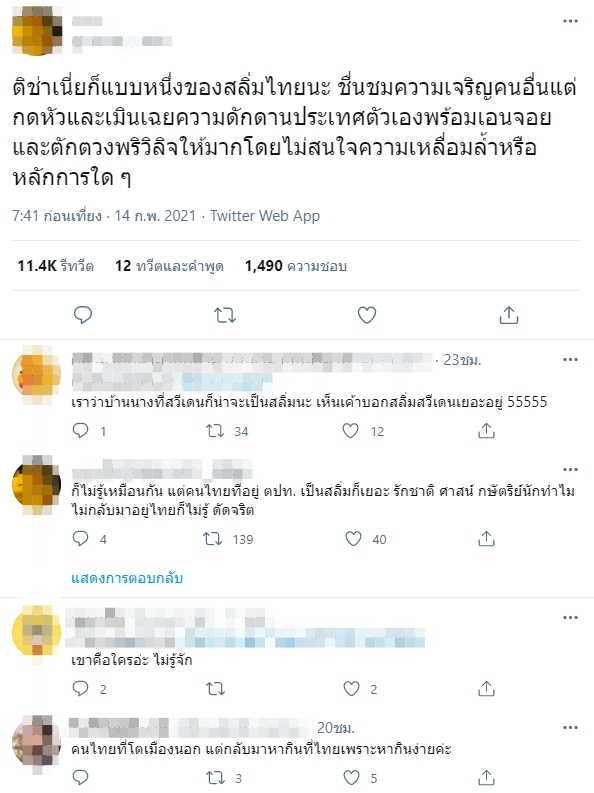 จนชาวเน็ตก็ได้ออกมาวิพากษ์วิจารณ์การกระทำดังกล่าวว่า “ติช่าเนี่ยก็แบบหนึ่งของสลิ่มไทยนะ ชื่นชมความเจริญคนอื่นแต่กดหัวและเมินเฉยความดักดานประเทศตัวเองพร้อมเอนจอยและตักตวงพริวิลิจให้มากโดยไม่สนใจความเหลื่อมล้ำหรือหลักการใด ๆ” และมีคนมาเสริมว่า “เราว่าบ้านนางที่สวีเดนก็น่าจะเป็นสลิ่มนะ เห็นเค้าบอกสลิ่มสวีเดนเยอะอยู่ 55555”, “ก็ไม่รู้เหมือนกัน แต่คนไทยที่อยู่ ตปท. เป็นสลิ่มก็เยอะ รักชาติ ศาสน์ กษัตริย์นักทำไมไม่กลับมาอยู่ไทยก็ไม่รู้ ดัดจริต” รวมถึง “อิติช่าศึกษามากพอรึยัง”, “นางปากเก่ง ปากดีทุกเรื่อง อุตส่าห์ไปโต ไปเรียนที่สวีเดน ทำตัวฝรั่งจ๋า แต่เรื่องเรียกร้องสิทธิมนุษยชนขั้นพื้นฐาน ที่ฝรั่งรณรงค์กันมาตลอด ในประเทศตัวเอง เสือกเงียบเชียว ก็เชิญค่ะ ใครอยากตามชีก็ตามไป ผิดหวังมากกับคนนี้”, “วงการอาหารเสริมเข้าแล้วออกยาก ไม่มีเวลาศึกษาเรื่องอื่นหรอกค่ะ”