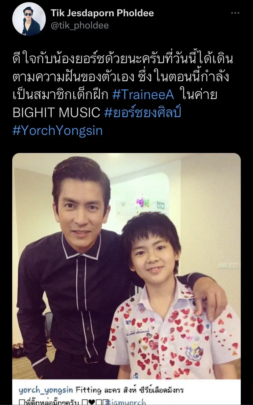 รวมถึง ติ๊ก เจษฎาภรณ์ พระเอกหนุ่มหล่อตลอดกาล ก็ได้มีการโพสต์ภาพที่ ยอร์ช เคยถ่ายรูปคู่ พร้อมกับโพสต์ถึงพี่ติ๊กว่า Fitting ละคร สิงห์ ซีรีส์เลือดมังกร พี่ติ๊กหล่อมั๊กๆครับ ซึ่งพี่ติ๊กก็ได้มีการโพสต์ถึง ยอร์ช เช่นกันว่า ดีใจกับน้องยอร์ชด้วยนะครับที่วันนี้ได้เดินตามความฝันของตัวเอง ซึ่งในตอนนี้กำลังเป็นสมาชิกเด็กฝึก #TraineeA ในค่าย BIGHIT MUSIC #ยอร์ชยงศิลป์ #YorchYongsin