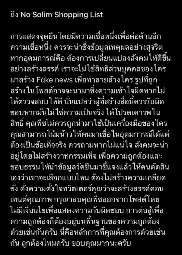 การแสดงจุดยืนโดยมีความเชื่อหนึ่งเพื่อต่อต้านอีกความเชื่อหนึ่ง ควรจะนำซึ่งข้อมูลเหตุผลอย่างสุจริต หากอุดมการณ์คือต้องการเปลี่ยนแปลงสังคมให้ดีขึ้นอย่างสร้างสรรค์ เราจะไม่ใช้สิทธิส่วนบุคคลของใครมาสร้าง Fake news เพื่อทำลายล้างใคร รูปที่ถูกสร้างในโพสต์อาจจะนำมาซึ่งความเข้าใจผิดหากไม่ได้ตรวจสอบให้ดี นั่นแปลว่าผู้ที่สร้างสื่อนี้ควรรับผิดชอบหากมันไม่ใช่ความเป็นจริง ได้โปรดเคารพในสิทธิ์ คุณพีชไม่ควรถูกนำมาใช้เป็นเครื่องมือของใคร คุณสามารถโน้มน้าวให้คนมาเชื่อในอุดมการณ์ได้แต่ต้องเป็นข้อเท็จจริง ควรถามหากไม่แน่ใจ สังคมจะน่าอยู่โดยไม่สร้างวาทกรรมเท็จ เพื่อความถูกต้องและชอบธรรมให้นำข้อมูลวัคซีนมาชี้แจงแล้วให้คนตัดสินเองว่าเขาจะเลือกแบบไหน ต้องไม่สร้างความเกลียดชัง ดั่งความตั้งใจทวิตเตอร์คุณว่าจะสร้างสรรค์คอนเทนต์คุณภาพ กรุณาลบคุณพีชออกจากโพสต์โดยไม่มีเงื่อนไขเพื่อแสดงความรับผิดชอบ การต่อสู้เพื่อความถูกต้องก็ต้องอยู่บนพื้นฐานของความถูกต้องด้วยเช่นกันครับ นี่คือหลักฐานที่คุณต้องการด้วยเช่นกัน ถูกต้องไหมครับ ขอบคุณมากนะครับ”