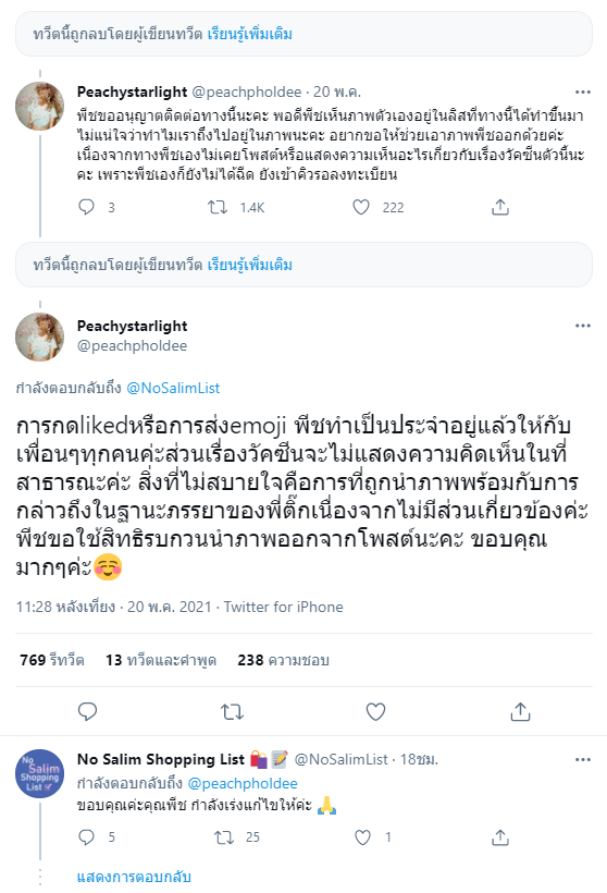 “การกด liked หรือการส่ง emoji พีชทำเป็นประจำอยู่แล้วให้กับเพื่อน ๆ ทุกคนค่ะ ส่วนเรื่องวัคซีนจะไม่แสดงความคิดเห็นในที่สาธารณะค่ะ สิ่งที่ไม่สบายใจคือการที่ถูกนำภาพพร้อมกับการกล่าวถึงในฐานะภรรยาของพี่ติ๊กเนื่องจากไม่มีส่วนเกี่ยวข้องค่ะ พีชขอใช้สิทธิรบกวนนำภาพออกจากโพสต์นะคะ ขอบคุณมาก ๆ ค่ะ”