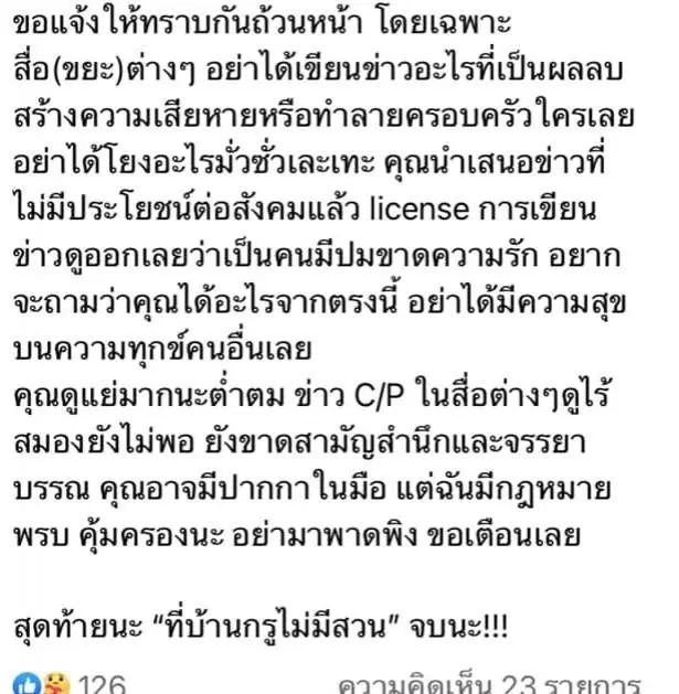 ด้านภรรยา ติ๊ก ชีโร่ โพสต์ร่ายยาวฟาดกลับสื่อขยะ เต้าประเด็นว่า ขอแจ้งให้ทราบกันถ้วนหน้า โดยเฉพาะสื่อ (ขยะ) ต่างๆ อย่าได้เขียนข่าวอะไรที่เป็นผลลบสร้างความเสียหายหรือทำลายครอบครัวใครเลย อย่าได้โยงอะไรมั่วชั่วเละเทะ คุณนำเสนอข่าวที่ไม่มีประโยชน์ต่อสังคมแล้ว license การเขียนข่าวดูออกเลยว่าเป็นคนมีปมขาดความรัก อยากจะถามว่าคุณได้อะไรจากตรงนี้ อย่าได้มีความสุขบนความทุกข์คนอื่นเลยคุณดูแย่มากนะต่ำตม ข่าว C/P ในสื่อต่างๆดูไร้สมองยังไม่พอ ยังขาดสามัญสำนึกและจรรยาบรรณ คุณอาจมีปากกาในมือ แต่ฉันมีกฎหมาย พรบ คุ้มครองนะ อย่ามาพาดพิง ขอเตือนเลยสุดท้ายนะ “ที่บ้านกรูไม่มีสวน” จบนะ!!! เรียกว่างานนี้สั่นสะเทือนไม่น้อยสำหรับวงการขาเมาส์