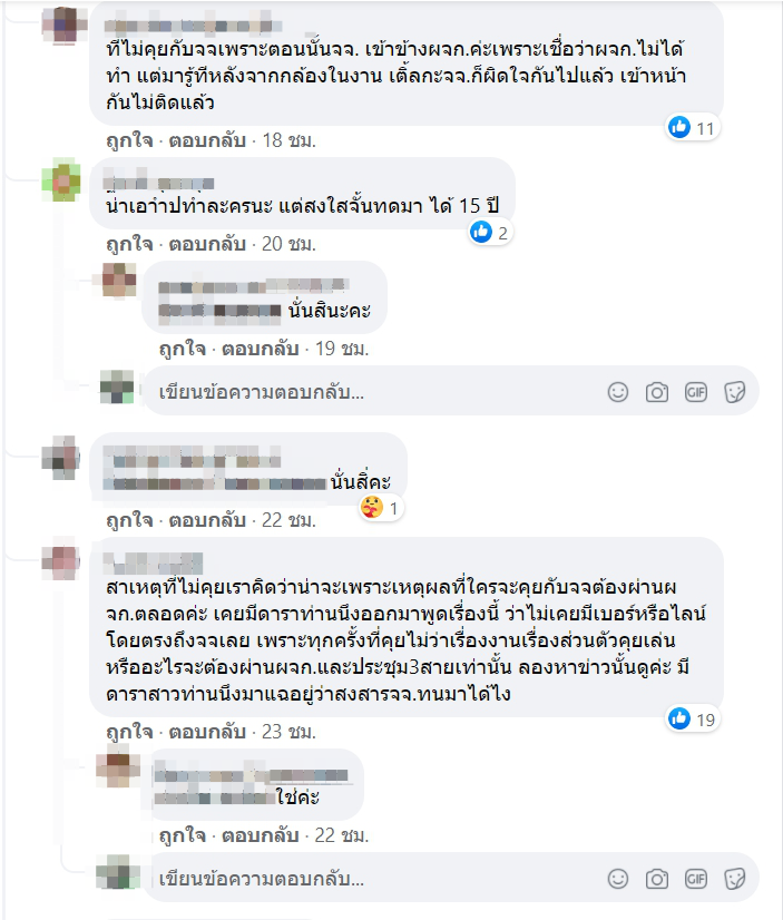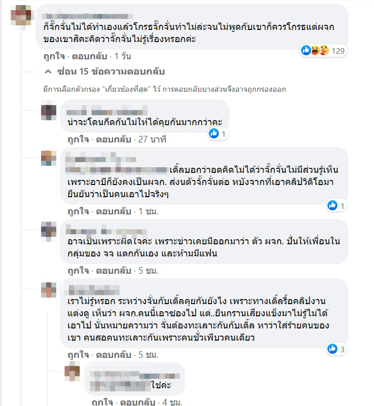 ก่อนที่จะมีคนออกมาอธิบายใต้คอมเมนท์ดังกล่าว ว่า “ที่ไม่คุยกับจจเพราะตอนนั้นจจ. เข้าข้างผจก.ค่ะเพราะเชื่อว่าผจก.ไม่ได้ทำ แต่มารู้ทีหลังจากกล้องในงาน เติ้ลกะจจ.ก็ผิดใจกันไปแล้ว เข้าหน้ากันไม่ติดแล้ว”, “สาเหตุที่ไม่คุยเราคิดว่าน่าจะเพราะเหตุผลที่ใครจะคุยกับจจต้องผ่านผจก.ตลอดค่ะ เคยมีดาราท่านนึงออกมาพูดเรื่องนี้ ว่าไม่เคยมีเบอร์หรือไลน์โดยตรงถึงจจเลย เพราะทุกครั้งที่คุยไม่ว่าเรื่องงานเรื่องส่วนตัวคุยเล่นหรืออะไรจะต้องผ่านผจก.และประชุม3สายเท่านั้น ลองหาข่าวนั้นดูค่ะ มีดาราสาวท่านนึงมาแฉอยู่ว่าสงสารจจ.ทนมาได้ไง”, “ที่ไม่คุยกับ จจ อาจเพราะว่าอารมณ์ เกลียดคนนี้แล้วพาลเกลียดเพื่อนสนิทของมันด้วยงี้ป่ะ เติ้ลคงอารมณ์นั้น หรือไม่ก็ จจ โดน ผจก ปั่น ผลิกเรื่องหรือกีดกันไม่ให้เขา2คนมีโอกาสได้เจอได้คุยกัน”