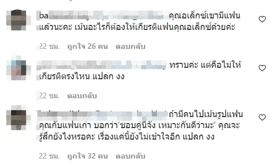 แต่ถึงแม้จะยังมีคนไม่มูฟออน แต่ก็มีเสียงจากแฟนคลับอีกด้านหนึ่ง ซึ่งก็ออกมาเตือนว่า สถานะตอนนี้เป็นเพื่อนคู่คิดที่ดีต่อกันจะดีกว่า ทั้งเต้ยและอเล็กซ์ ต่างก็มูฟออนแล้ว ฝั่งชายก็มีคนรักใหม่แล้ว อยากให้คอมเมนต์อะไรก็นึกถึงและให้เกียรติคนของอีกฝั่งด้วย